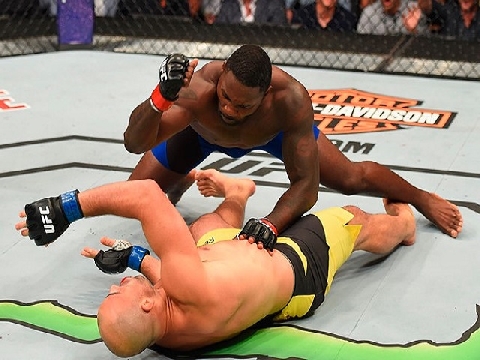 Chỉ chờ đúng "thời cơ ngàn vàng" này, võ sĩ quần xanh đã tung một cú đấm trời giáng trúng mặt khiến đối thủ phải lập tức đo ván.